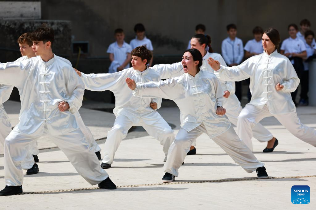 Estudantes apresentam Tai Chi Chuan em evento cultural chinês chamado "Celebrando a Primavera" em Roma, Itália, no dia 8 de abril de 2025. Dezenas de estudantes italianos em um internato em Roma demonstraram sua paixão pela língua e cultura chinesas por meio de várias apresentações na terça-feira. (Xinhua/Li Jing)