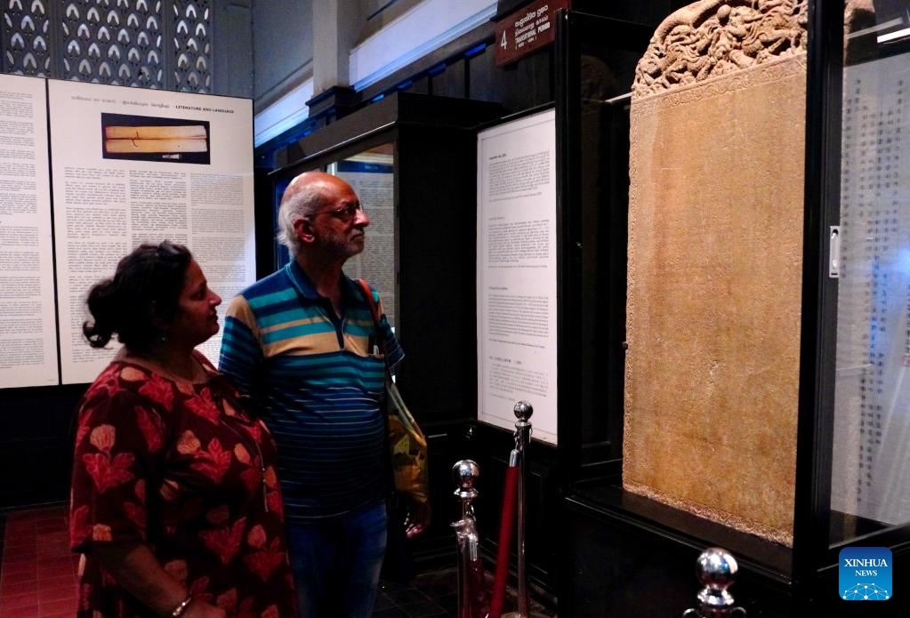 Visitantes observam Inscrição Trilíngue no Museu Nacional de Colombo, em Colombo, Sri Lanka, no dia 17 de abril de 2025. Três coleções do patrimônio documental enviadas pela China foram inscritas no Registro da Memória do Mundo da UNESCO, anunciou a Organização das Nações Unidas para a Educação, a Ciência e a Cultura (ONU) na quinta-feira.