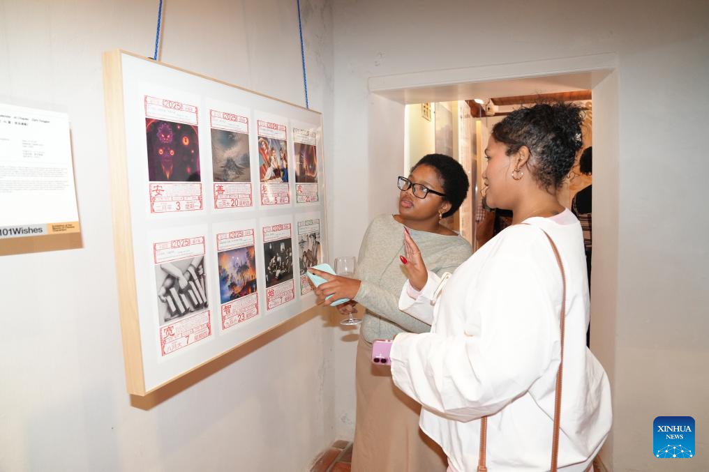 Visitantes na exposição "101 Desejos: A Beleza dos Caracteres Chineses" no evento do Dia Internacional da Língua Chinesa 2025 na Cidade do Cabo, África do Sul, no dia 17 de abril de 2025. Uma animada comemoração do Dia Internacional da Língua Chinesa 2025, sob o tema "Língua Chinesa: Juntos por um Futuro Brilhante", foi realizada na quinta-feira no Centro de Aprendizagem Iziko, na Cidade do Cabo. (Xinhua/Wang Lei)