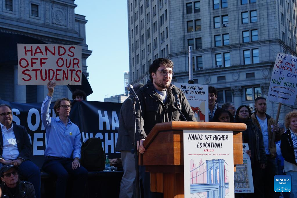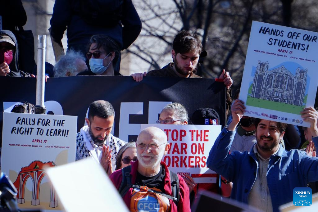 Nova York, 17 abr (Xinhua) -- Centenas de professores, estudantes, pesquisadores e funcionários de universidades de Nova York se reuniram em Manhattan na quinta-feira contra as políticas e e os cortes de financiamento do ensino superior promovidos pelo governo Trump.