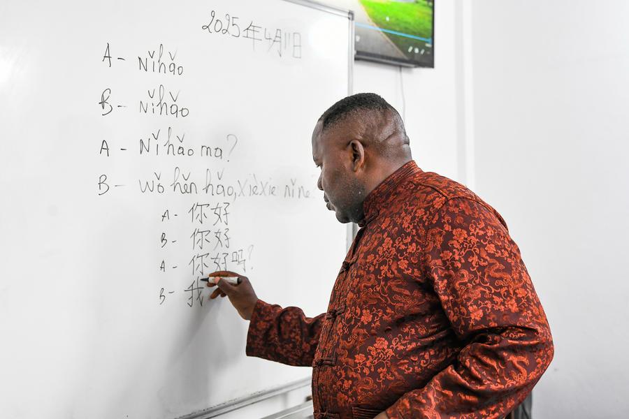 Celestin Alexis Nono escreve palavras em chinês no quadro para ensinar seus alunos em Yaoundé, capital de Camarões, em 11 de abril de 2025. (Xinhua/Kepseu)
