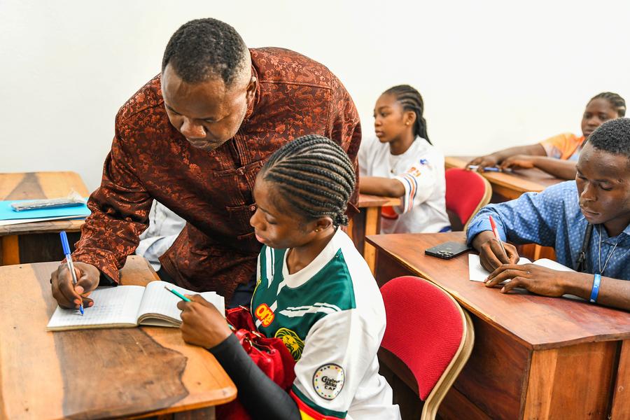Celestin Alexis Nono ensina uma aluna a escrever em chinês em seu caderno em Yaoundé, capital de Camarões, em 11 de abril de 2025. (Xinhua/Kepseu)