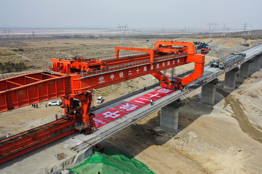Foto aérea tirada por drone em 6 de março de 2025 mostra a Grande Ponte Heyuancun da Ferrovia de Alta Velocidade Baotou-Yinchuan fechada na Região Autônoma da Mongólia Interior, no norte da China. (Xinhua/Li Zhipeng)