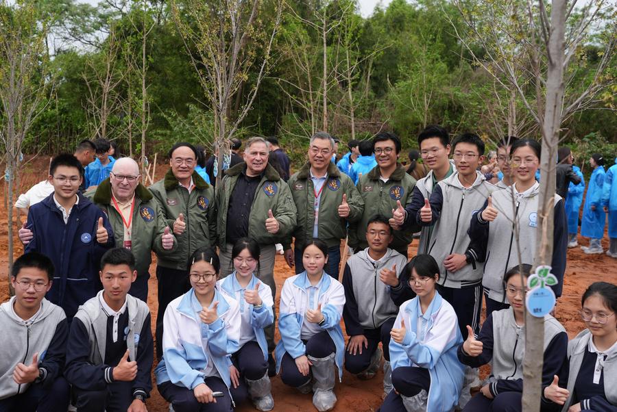 Convidados e estudantes posam para foto em grupo após plantio de árvores na cidade de Quzhou, Província de Zhejiang, leste da China, no dia 17 de abril de 2025. (Xinhua/Huang Zongzhi)