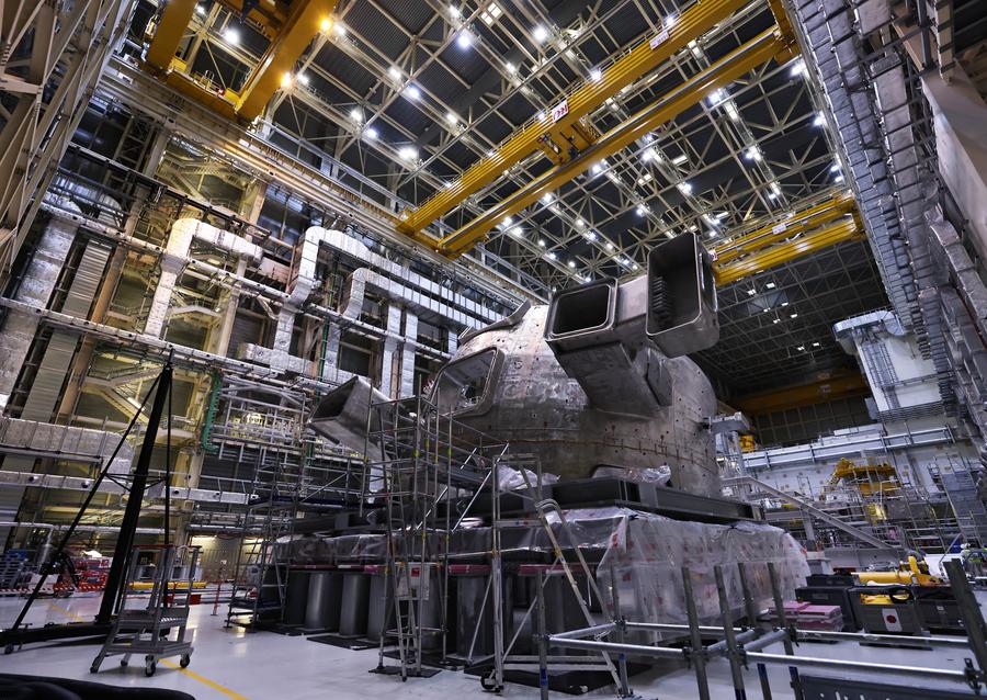 Enorme dispositivo em sala de pré-montagem da maior máquina de experimentos de fusão do mundo, o ITER Tokamak, em St. Paul-Lez-Durance, França, no dia 23 de novembro de 2023. (Xinhua/Gao Jing)