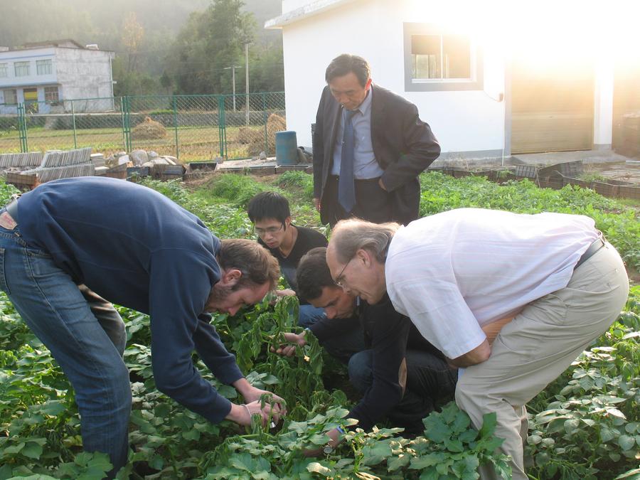 Foto mostra agrônomo belga, François Serneels (primeiro, à direita) observando cultivo de batatas em campo com estudantes e parceiros chineses no Condado de Wuxi, Chongqing, em 2012. (Xinhua)