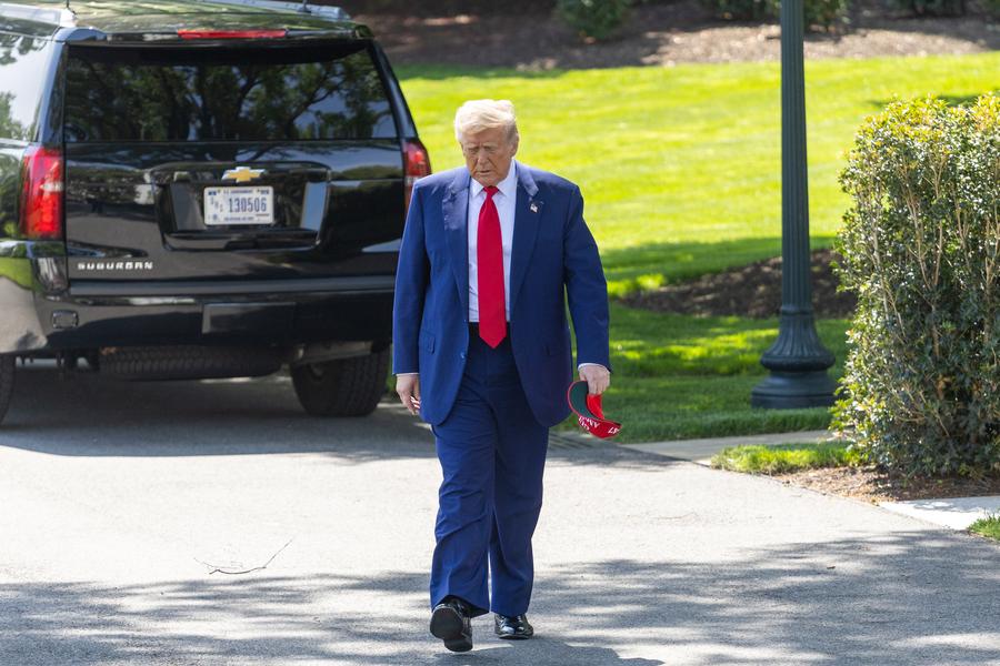 O presidente dos EUA, Donald Trump, caminha em direção à imprensa antes de embarcar no Marine One no gramado sul da Casa Branca, em Washington, D.C., Estados Unidos, no dia 29 de abril de 2025. (Xinhua/Hu Yousong)