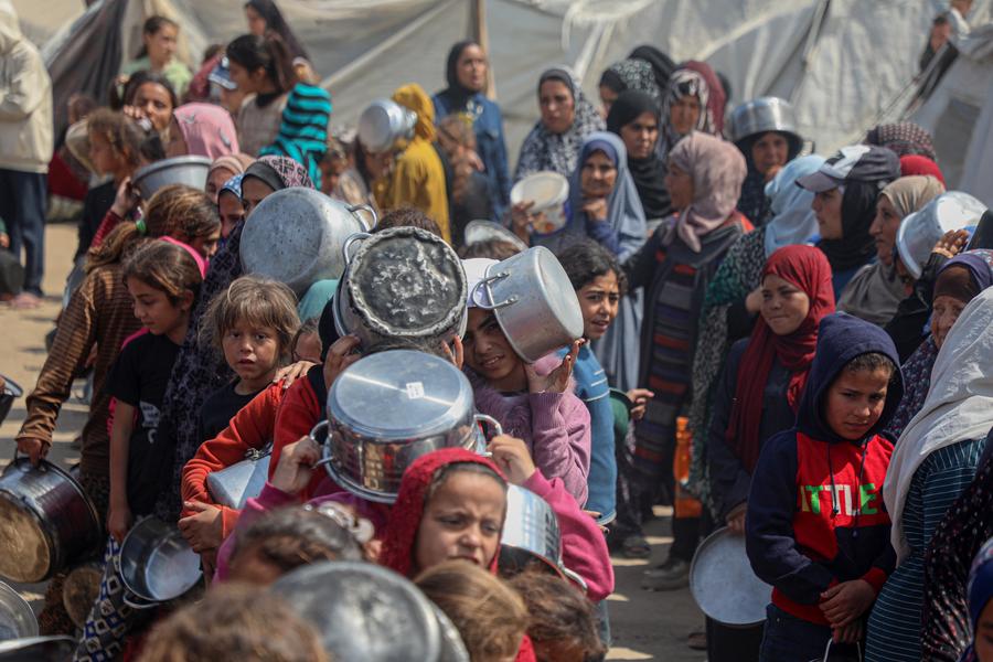 Palestinos aguardam comida gratuita em centro de distribuição de alimentos na Cidade de Gaza, no dia 2 de maio de 2025. (Foto por Rizek Abdeljawad/Xinhua)