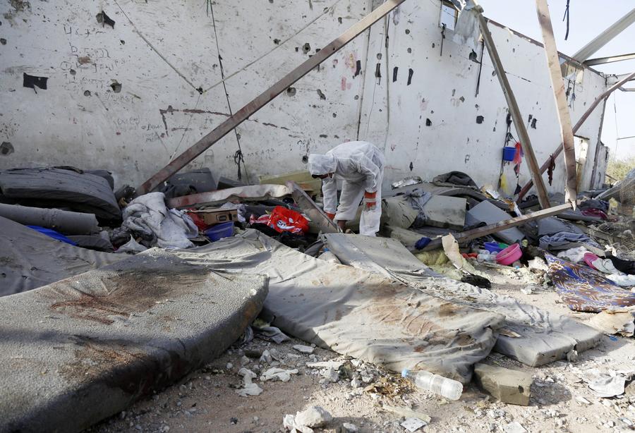 Investigador procura evidências entre escombros do centro de migrantes destruído pelos ataques aéreos dos EUA na província de Saada, Iêmen, no dia 28 de abril de 2025. (Foto por Mohammed Mohammed/Xinhua)
