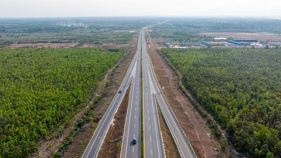 Foto aérea de drone tirada no dia 18 de março de 2025 mostra trecho da Via Expressa Phnom Penh-Sihanoukville, no Camboja. (Xinhua/Cheong Kam Ka)