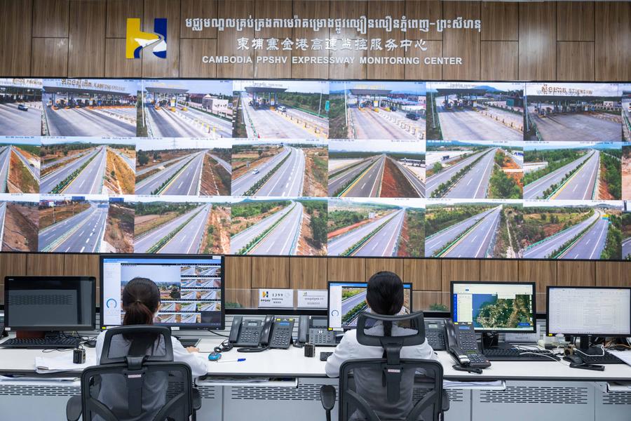 Funcionários de plantão no centro de monitoramento da Rodovia Expressa Phnom Penh-Sihanoukville, em Phnom Penh, Camboja, no dia 15 de março de 2025. A Rodovia Expressa Phnom Penh-Sihanoukville, um projeto da Iniciativa Cinturão e Rota, conta com o investimento da China Road and Bridge Corporation sob o modelo construir-operar-transferir (BOT, na sigla em inglês) e é a primeira rodovia expressa do Camboja. (Xinhua/Cheong Kam Ka)