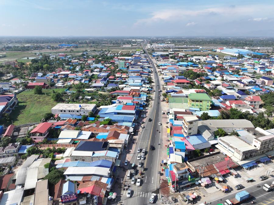 Foto aérea de drone tirada no dia 21 de abril de 2025 mostra Estrada Nacional 41, financiada pela China, na província de Kandal, Camboja. (Foto por Nitola/Xinhua)