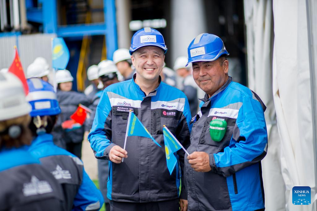 Trabalhadores na cerimônia de inauguração do projeto de expansão e modernização da Usina de Asfalto do Cáspio em Aktau, Cazaquistão, no dia 5 de maio de 2025. A cerimônia de inauguração do projeto de expansão e modernização da Usina de Asfalto do Cáspio foi realizada na segunda-feira. Construída pela China CITIC Construction Co., Ltd., a usina modernizada aumentou sua capacidade anual de processamento de petróleo bruto de 1 milhão de toneladas para 1,5 milhão de toneladas, com a produção de asfalto aumentando de 500.000 toneladas para 750.000 toneladas anualmente. (China CITIC Construction Co., Ltd./Divulgação via Xinhua)