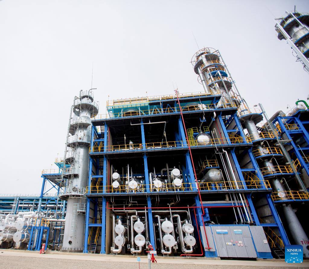 Foto mostra parte da Usina de Asfalto do Cáspio em Aktau, Cazaquistão, no dia 5 de maio de 2025. A cerimônia de inauguração do projeto de expansão e modernização da Usina de Asfalto do Cáspio foi realizada na segunda-feira. Construída pela China CITIC Construction Co., Ltd., a usina modernizada aumentou sua capacidade anual de processamento de petróleo bruto de 1 milhão de toneladas para 1,5 milhão de toneladas, com a produção de asfalto aumentando de 500.000 toneladas para 750.000 toneladas anualmente. (China CITIC Construction Co., Ltd./Divulgação via Xinhua)
