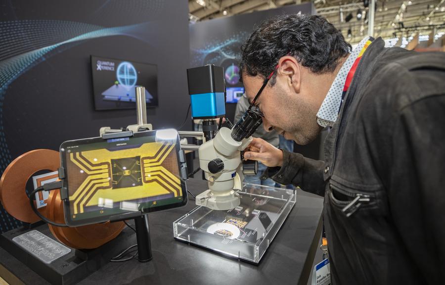 Homem observa uma peça exibida através de um microscópio na Feira de Hannover 2025 em Hannover, Alemanha, em 31 de março de 2025. (Xinhua/Zhang Fan)