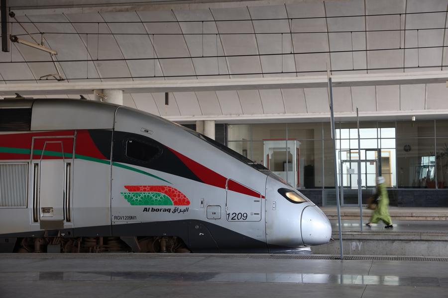 Mulher passa por trem de alta velocidade na estação ferroviária de Rabat Agdal, em Rabat, Marrocos, no dia 20 de abril de 2025. (Xinhua/Huo Jing)