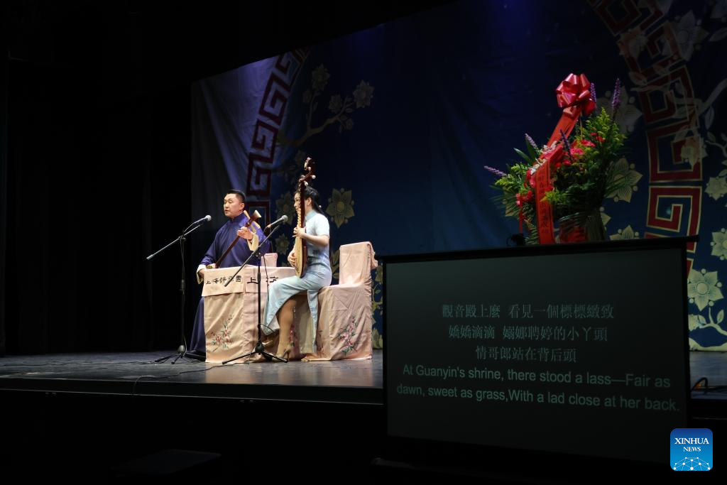 Artistas da Trupe de Pingtan de Shanghai se apresentam no Flushing Town Hall em Nova York, Estados Unidos, em 11 de maio de 2025. A tradicional arte da ópera chinesa Pingtan está mais uma vez ocupando o centro do palco nos Estados Unidos. A Trupe de Pingtan de Shanghai está percorrendo as principais cidades, incluindo Los Angeles, São Francisco, Nova York e Atlanta, com uma apresentação especial nas Nações Unidas. Essa turnê de intercâmbio cultural "Graceful Jiangnan in Spring Breeze", que vai de 30 de abril a 16 de maio, marca a segunda visita da trupe aos Estados Unidos. (Foto por Li Xirui/Xinhua)