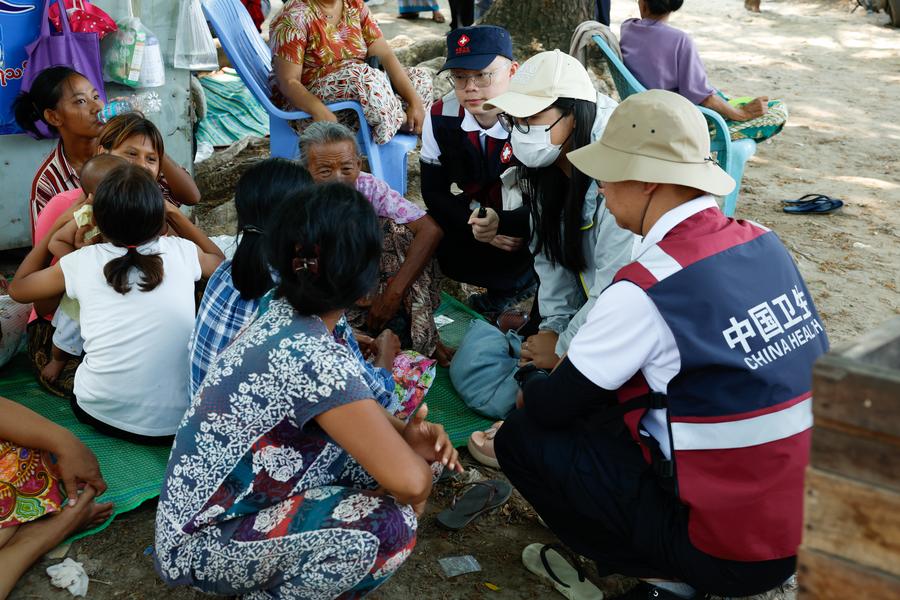 Membros da equipe chinesa de prevenção de infecção em Mianmar visitam um abrigo de alívio do terremoto em Mandalay, Mianmar, em 9 de maio de 2025. (Xinhua/Myo Kyaw Soe)