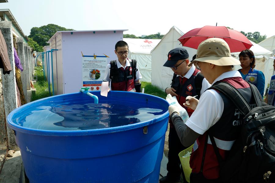 Membros da equipe chinesa de prevenção de infecção em Mianmar coletam amostras de água em um abrigo de alívio do terremoto em Mandalay, Mianmar, em 9 de maio de 2025. (Xinhua/Myo Kyaw Soe)