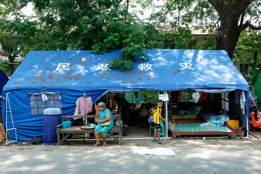 Pessoas afetadas pelo terremoto são fotografadas em uma tenda doada pela China em Mandalay, Mianmar, em 9 de maio de 2025. (Xinhua/Myo Kyaw Soe)