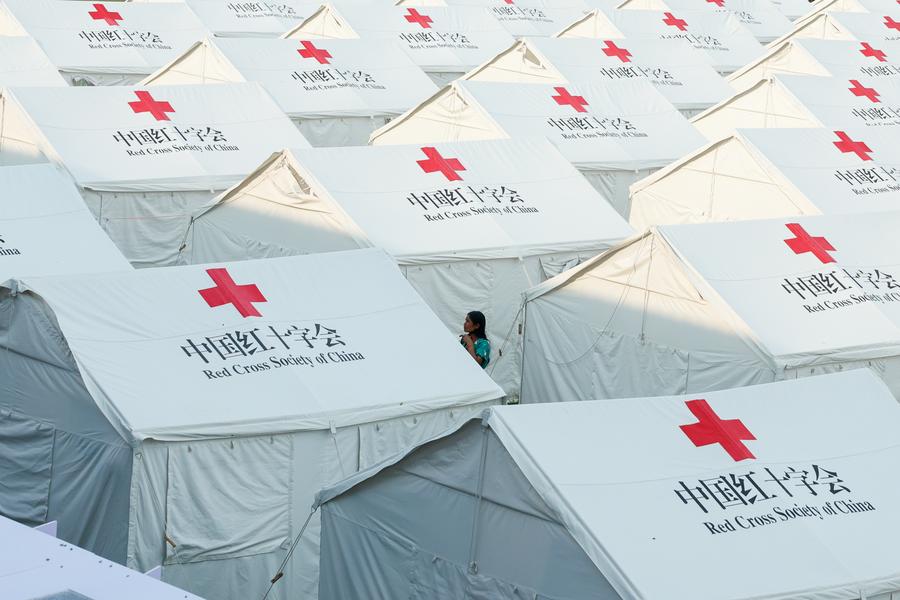 Foto tirada em 10 de maio de 2025 mostra tendas doadas pela China em um abrigo de ajuda humanitária em Mandalay, Mianmar. (Xinhua/Myo Kyaw Soe)