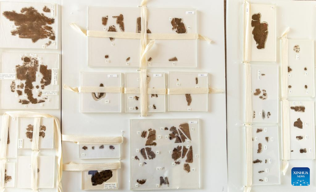 Foto tirada no dia 16 de maio de 2025 mostra antigos manuscritos de seda chineses, do período dos Estados Combatentes, na Embaixada da China em Washington, D.C., Estados Unidos. (Xinhua/Hu Yousong)