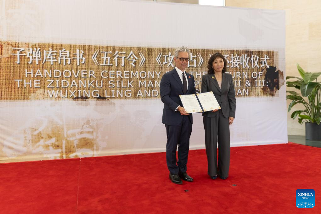 Washington, 16 mai (Xinhua) -- O Museu Nacional de Arte Asiática do Smithsonian devolveu oficialmente na sexta-feira os volumes 2 e 3 do Manuscrito de Seda de Zidanku: Wuxing Ling e Gongshou Zhan, do período dos Estados Combatentes, para a Administração Nacional do Patrimônio Cultural da China.