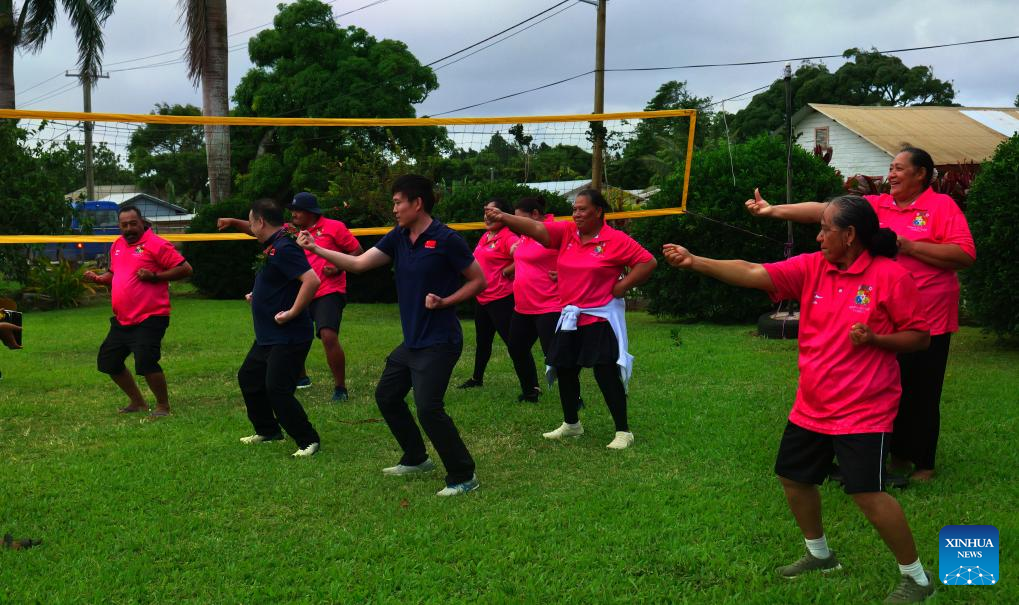 Equipe médica chinesa leva moradores locais a praticar o tradicional exercício físico chinês Baduanjin na Ilha Eua, Tonga, no dia 23 de maio de 2025. (Xinhua)