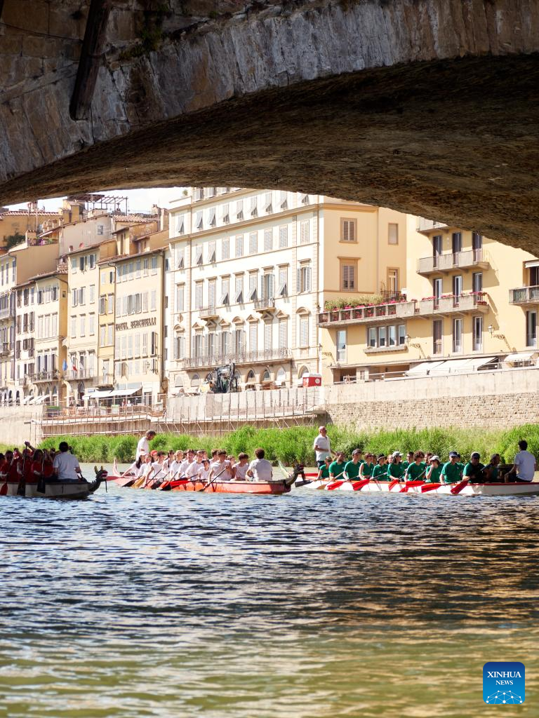Florença, Itália, 2 jun (Xinhua) -- Tendo como pano de fundo o horizonte renascentista de Florença, a batida rítmica dos tambores de três barcos do dragão correndo no Rio Arno atraiu multidões ao longo das margens, marcando uma celebração vibrante do tradicional Festival de Barcos do Dragão da China.