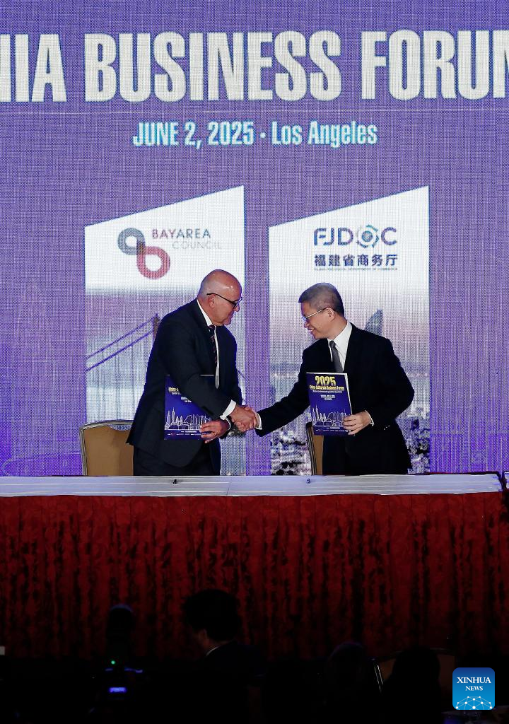Cerimônia de assinatura realizada no Fórum Empresarial China-Califórnia 2025, em Los Angeles, Califórnia, Estados Unidos, no dia 2 de junho de 2025. O Fórum Empresarial China-Califórnia 2025 foi realizado na segunda-feira, atraindo cerca de 500 empresários e autoridades da China e do estado americano da Califórnia para promover intercâmbios econômicos, comerciais e culturais mais fortes. (Foto por Qiu Chen/Xinhua)