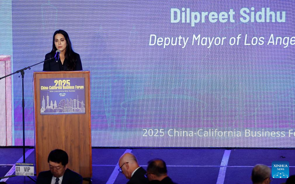 Dilpreet Sidhu, vice-prefeita de Los Angeles, discursa no Fórum Empresarial China-Califórnia 2025, em Los Angeles, Califórnia, Estados Unidos, no dia 2 de junho de 2025. O Fórum Empresarial China-Califórnia 2025 foi realizado na segunda-feira, atraindo cerca de 500 empresários e autoridades da China e do estado americano da Califórnia para promover intercâmbios econômicos, comerciais e culturais mais fortes. (Foto por Qiu Chen/Xinhua)