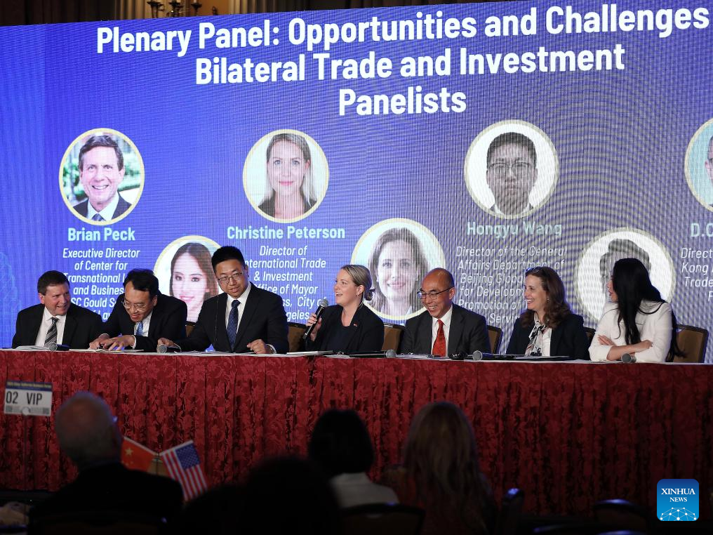 Convidados participam de painel de discussão no Fórum Empresarial China-Califórnia 2025, em Los Angeles, Califórnia, Estados Unidos, no dia 2 de junho de 2025. O Fórum Empresarial China-Califórnia 2025 foi realizado na segunda-feira, atraindo cerca de 500 empresários e autoridades da China e do estado americano da Califórnia para promover intercâmbios econômicos, comerciais e culturais mais fortes. (Foto por Qiu Chen/Xinhua)