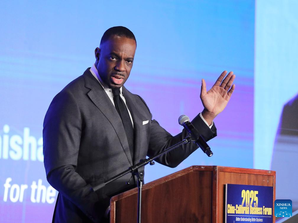 O secretário de Transportes do Estado da Califórnia, Toks Omishakin, discursa no Fórum Empresarial China-Califórnia 2025, em Los Angeles, Califórnia, Estados Unidos, no dia 2 de junho de 2025. O Fórum Empresarial China-Califórnia 2025 foi realizado na segunda-feira, atraindo cerca de 500 empresários e autoridades da China e do estado americano da Califórnia para promover intercâmbios econômicos, comerciais e culturais mais fortes. (Foto por Qiu Chen/Xinhua)