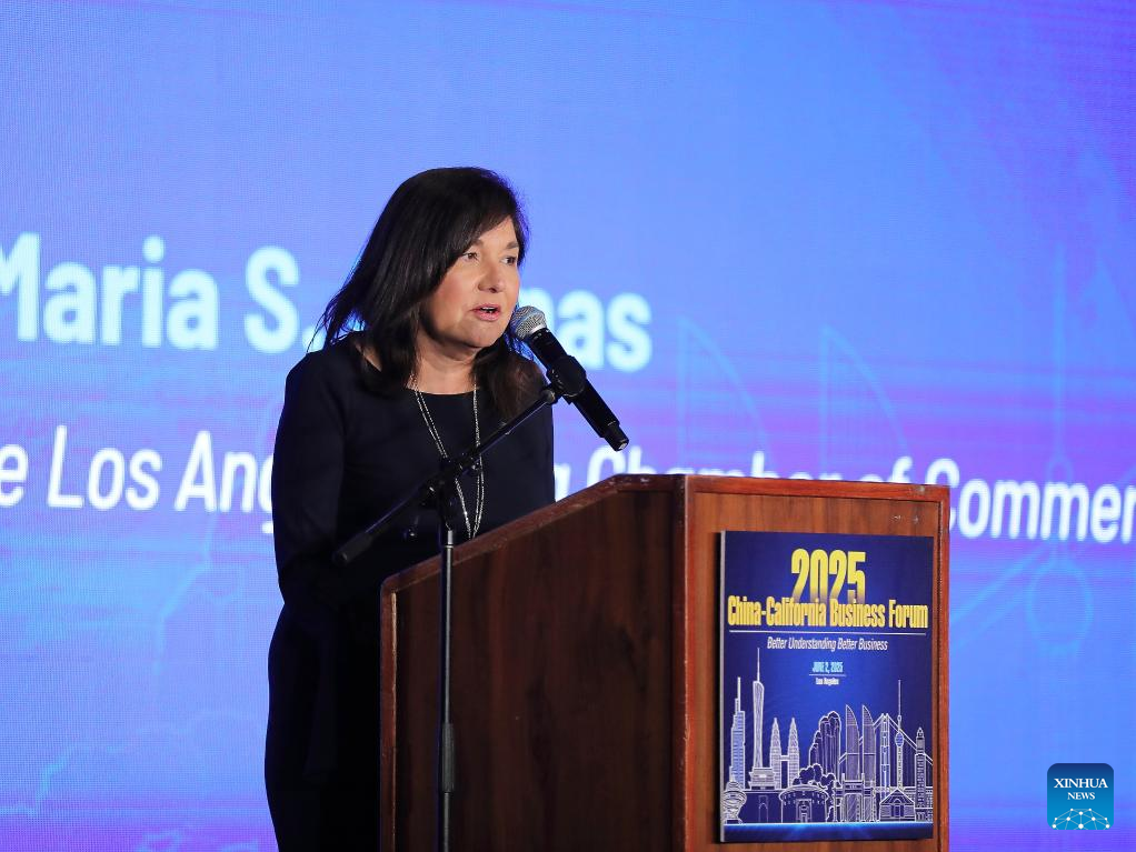 Maria S. Salinas, presidente e CEO da Câmara de Comércio da Área de Los Angeles, discursa durante o Fórum Empresarial China-Califórnia 2025, em Los Angeles, Califórnia, Estados Unidos, em 2 de junho de 2025. (Foto por Qiu Chen/Xinhua)