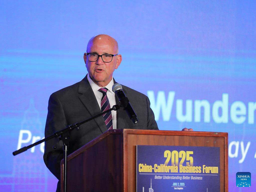 Jim Wunderman, presidente e CEO do Conselho da Área da Baía de São Francisco, discursa durante o Fórum Empresarial China-Califórnia 2025, em Los Angeles, Califórnia, Estados Unidos, em 2 de junho de 2025. (Foto por Qiu Chen/Xinhua)