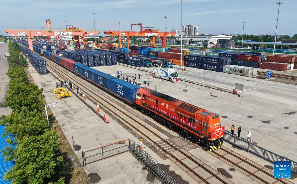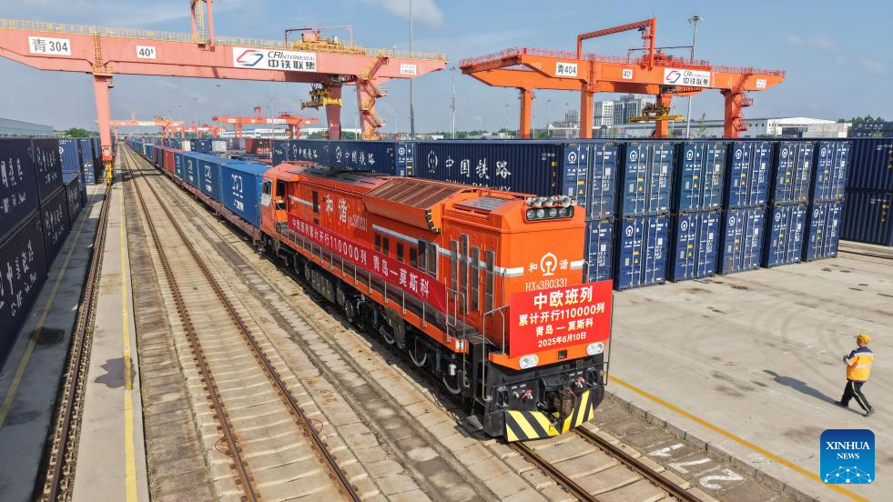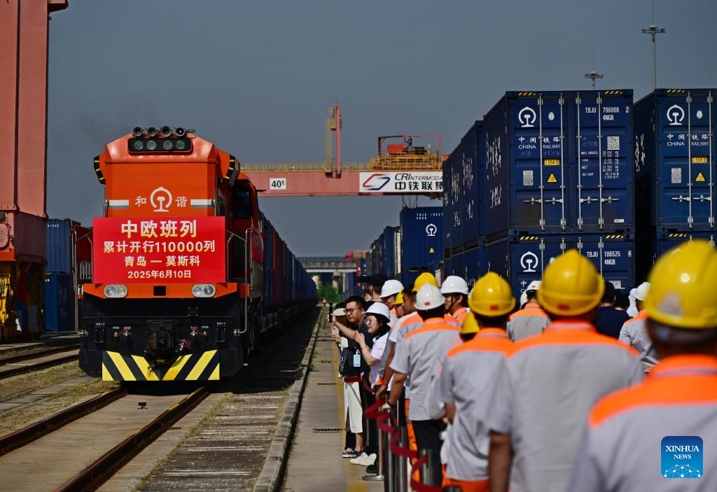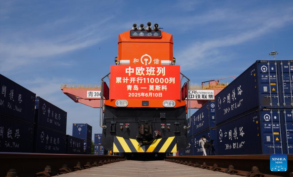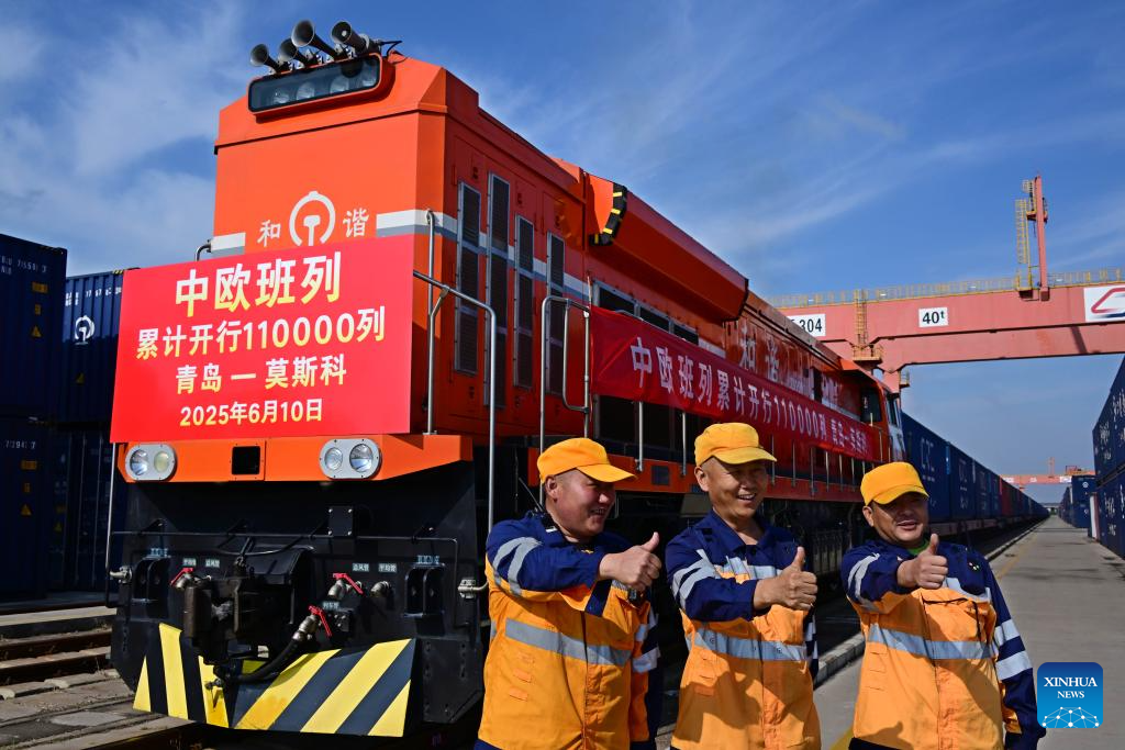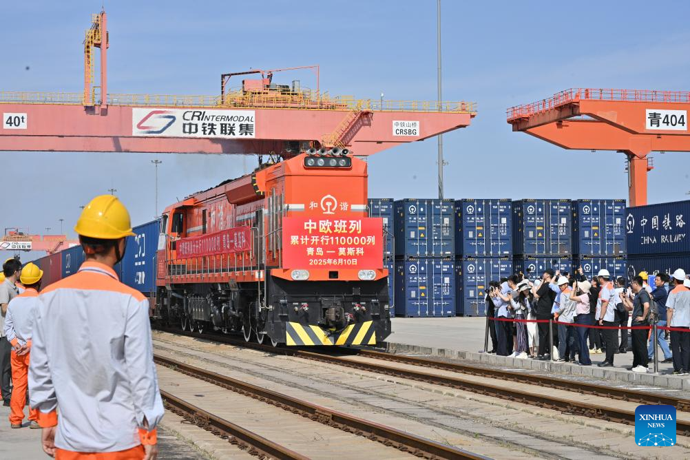 Jinan, 10 jun (Xinhua) -- O 110.000º trem de carga China-Europa partiu de Qingdao, na Província de Shandong, leste da China, na manhã desta terça-feira, estabelecendo um marco no desenvolvimento de alta qualidade do serviço.