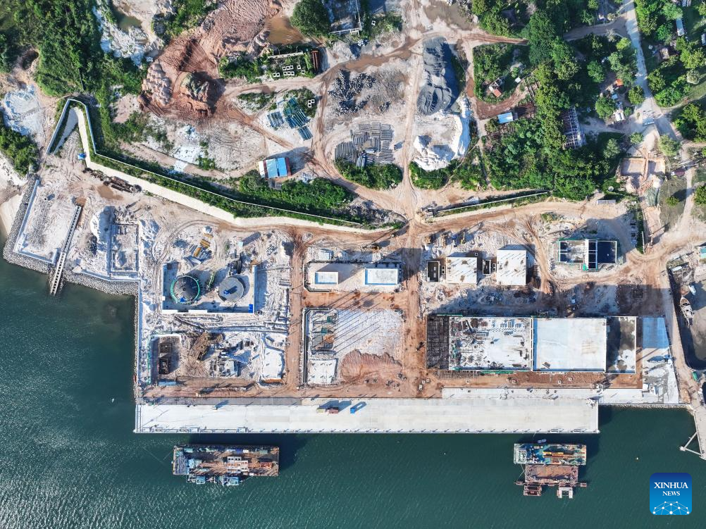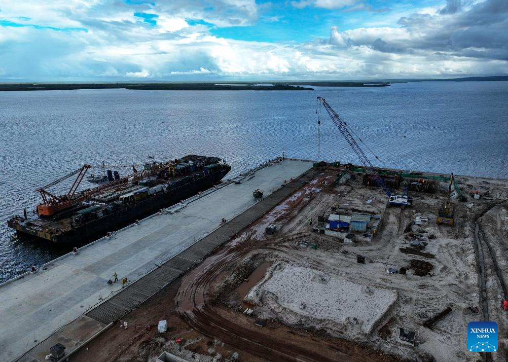 Foto aérea tirada com drone em 23 de abril de 2025 mostra o Porto de Pesca de Kilwa em construção perto de Kilwa Kisiwani, na Tanzânia. O projeto, construído pela China Harbor Engineering Company Ltd (CHEC), uma importante construtora chinesa, é o primeiro porto de pesca moderno de grande porte da Tanzânia. Com cerca de 5,6 hectares, ele foi projetado para receber 60.000 toneladas de peixes anualmente e pode atracar embarcações de pesca em alto mar, de acordo com Chen Zhifeng, vice-gerente de projetos do departamento de projetos marítimos da CHEC Tanzânia. (Xinhua/Li Yahui)