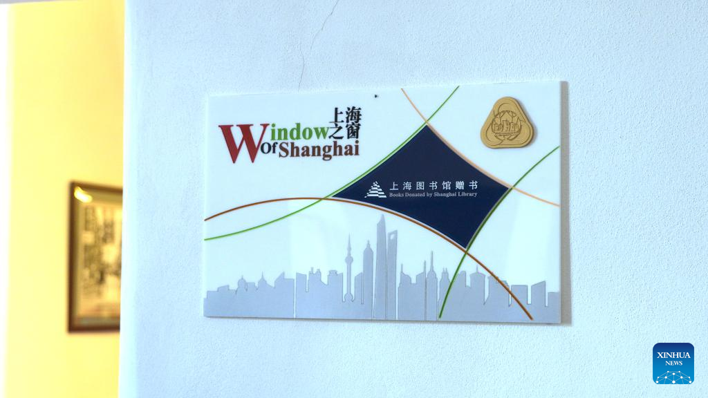 Foto tirada no dia 5 de junho de 2025 mostra placa "Janela de Shanghai" fora da sala da Biblioteca Científica Estatal em Banska Bystrica, Eslováquia. (Foto por Peter Lahky/Xinhua)
