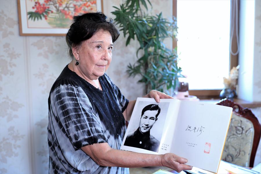 Baldyrgan Baikadamova, filha do músico cazaque Bakhitzhan Baikadamov, mostra álbum comemorativo de Xian Xinghai em Almaty, Cazaquistão, no dia 21 de maio de 2021. (Foto por Kalizhan Ospanov/Xinhua)