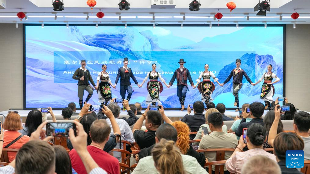 Artistas sérvios apresentam o Conjunto Nacional da Sérvia "Kolo" no Centro Cultural da China em Belgrado, Sérvia, em 16 de junho de 2025. Intitulado "Ressonância da Rota da Seda, Ecos da Ópera Atemporal", um evento com trechos de clássicos da ópera cantonesa interpretados por artistas da Companhia de Ópera Cantonense de Guangzhou foi realizado na segunda-feira em Belgrado. O programa também incluiu solos instrumentais, uma dança de manga comprida, uma exibição de artes marciais e uma apresentação especial da dança folclórica coletiva tradicional da Sérvia "Kolo". O evento foi realizado pela Associação de Teatro da China, o Centro Cultural da China em Belgrado e o Instituto do Cinturão e Rota, e coorganizado pela Companhia de Ópera Cantonesa de Guangzhou e instituições culturais da Sérvia. (Foto por Wang Wei/Xinhua)