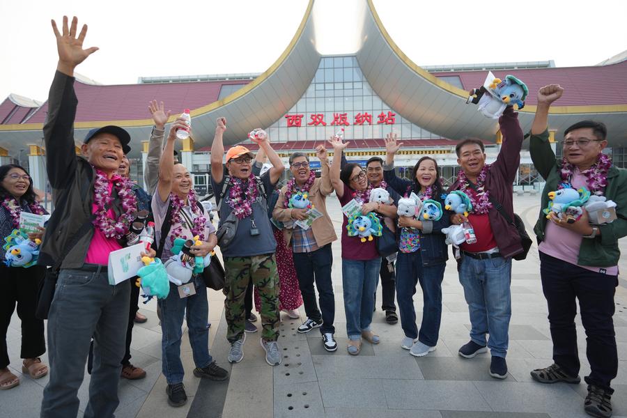 Membros de um grupo turístico, o primeiro dos Estados-membros da Associação das Nações do Sudeste Asiático (ASEAN, na sigla em inglês) desde que a China introduziu sua nova política de flexibilização de vistos, posam para fotos em frente à estação ferroviária de Xishuangbanna, na Cidade de Jinghong, Prefeitura Autônoma da Etnia Dai de Xishuangbanna, Província de Yunnan, sudoeste da China, em 18 de fevereiro de 2025. (Xinhua/Chen Xinbo)