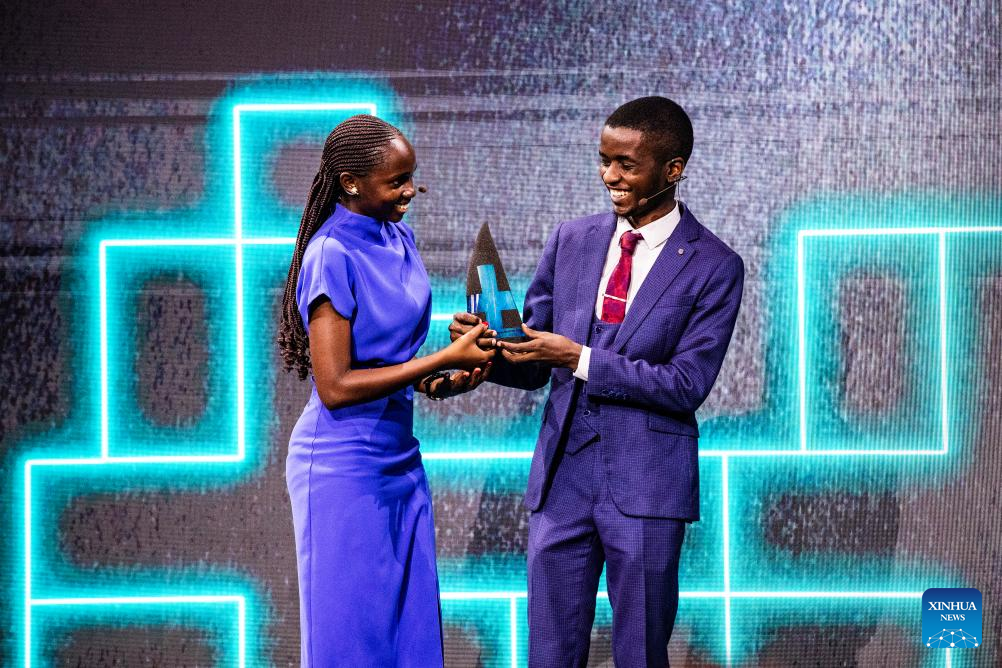 Foto tirada em 18 de junho de 2025 mostra Sandra Namboozo (e) e Samuel Muyita na cerimônia de premiação do Prêmio para Jovens Inventores, realizada pelo Instituto Europeu de Patentes (IEP) em Reykjavik, Islândia. (IEP/Divulgação via Xinhua)