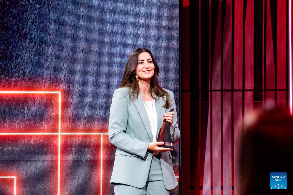 Foto tirada em 18 de junho de 2025 mostra Marie Perrin na cerimônia de premiação do Prêmio Jovens Inventores, realizada pelo Instituto Europeu de Patentes (IEP) em Reykjavik, Islândia. (IEP/Divulgação via Xinhua)