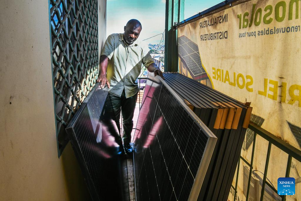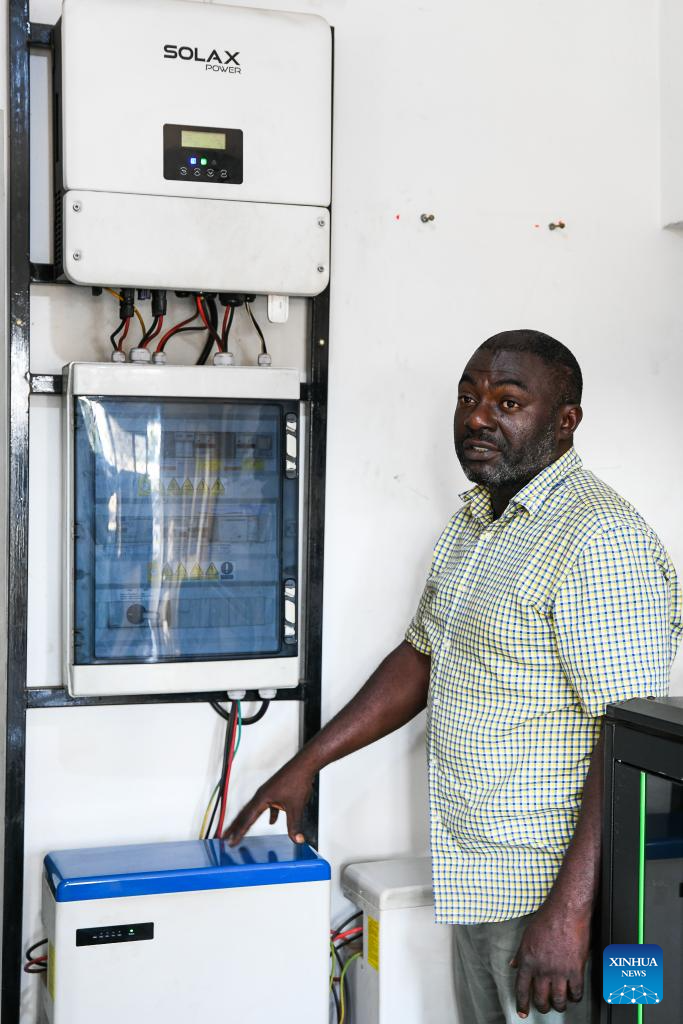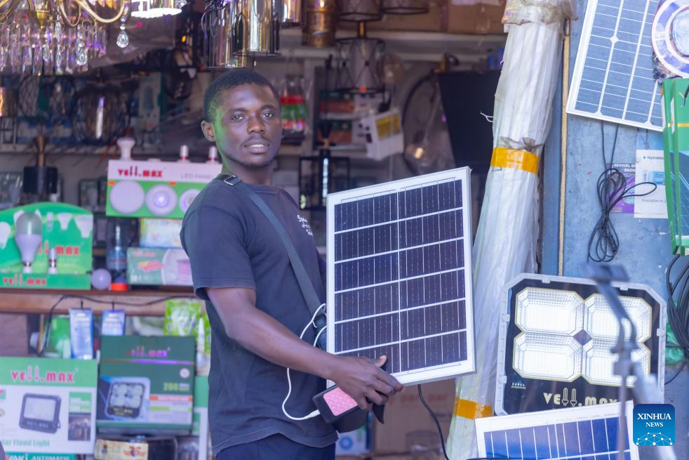 Empresário mostra equipamentos fotovoltaicos em frente à sua loja em Buea, Região Sudoeste, Camarões, no dia 17 de junho de 2025. (Foto por Muleng Timngum/Xinhua)