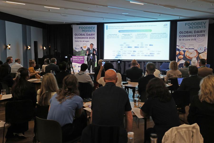 Foto tirada em 18 de junho de 2025 mostra palestra do 18º Congresso Global de Laticínios em Amsterdã, Holanda. (Xinhua/Zhao Dingzhe)
