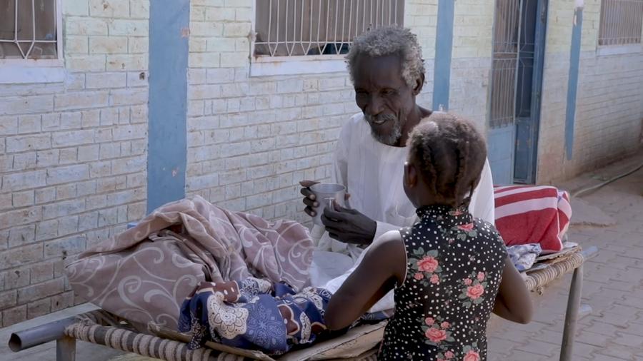 Foto sem data mostra paciente conversando com menina em um hospital administrado pelo Comitê Internacional da Cruz Vermelha (CICV) na cidade de Atbara, Sudão. (CICV-Sudão/Divulgação via Xinhua)