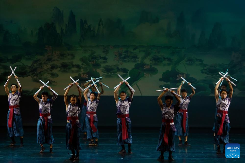 Bucareste, 29 jun (Xinhua) -- Uma apresentação especial de dança dramática de kung fu chinês "11 Guerreiros" cativou o público na Ópera Nacional de Bucareste na noite de sábado, em comemoração ao Dia Internacional do Diálogo entre Civilizações.
