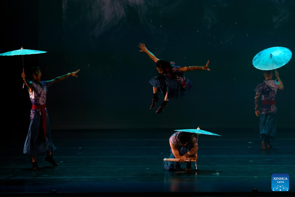 Integrantes do Grupo de Artes Marciais Longyun em apresentação especial de dança dramática de kung fu chinês "11 Guerreiros" na Ópera Nacional de Bucareste, em comemoração ao Dia Internacional do Diálogo entre Civilizações em Bucareste, Romênia, no dia 28 de junho de 2025. Organizado pela Embaixada da China na Romênia, pelo Centro Cultural Chinês de Bucareste e pela Casa Romênia-China, o evento atraiu mais de 900 participantes, incluindo diplomatas, autoridades culturais e figuras públicas. A apresentação foi feita pelo Grupo de Artes Marciais Longyun, fundado pelo renomado astro do cinema chinês Jackie Chan. Combinando artes marciais, dança moderna e multimídia, a produção traça a evolução do kung fu chinês, desde suas origens no combate até sua profundidade filosófica e espiritual. (Foto por Cristian Cristel/Xinhua)