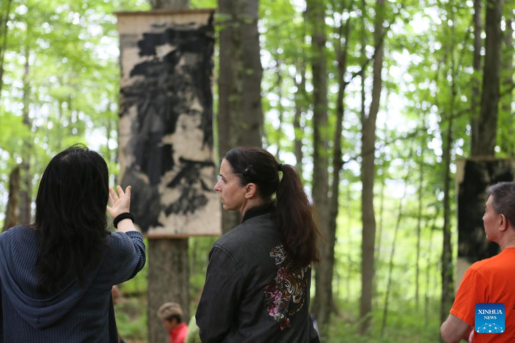 Lenox, Massachusetts, Estados Unidos, 30 jun (Xinhua) -- Em um canto arborizado do Eastover Estate & Eco-Village, uma dúzia de pergaminhos altos, com aproximadamente um metro de largura e três metros de altura, balançam silenciosamente ao vento do verão, visivelmente transformados pela chuva, neve, luz solar e tempo desde que foram instalados há um ano.