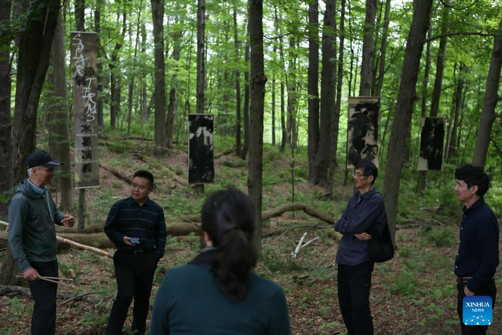O pintor chinês Lan Zhenghui (3º, à esquerda.) mostra sua obra na exposição ao ar livre "Termos Solares: Evento de Arte Contemporânea com Tinta" em Lenox, Massachusetts, Estados Unidos, no dia 28 de junho de 2025. Em um canto arborizado do Eastover Estate & Eco-Village, uma dúzia de pergaminhos altos, com aproximadamente um metro de largura e três metros de altura, balançam silenciosamente ao vento do verão, visivelmente transformados pela chuva, neve, luz solar e tempo desde que foram instalados há um ano. Os pergaminhos foram pintados em papel de arroz, fixados em um tecido não tecido durável e, depois, emoldurados e suspensos entre árvores na floresta do estado americano de Massachusetts. (Xinhua/Zhang Fengguo)
